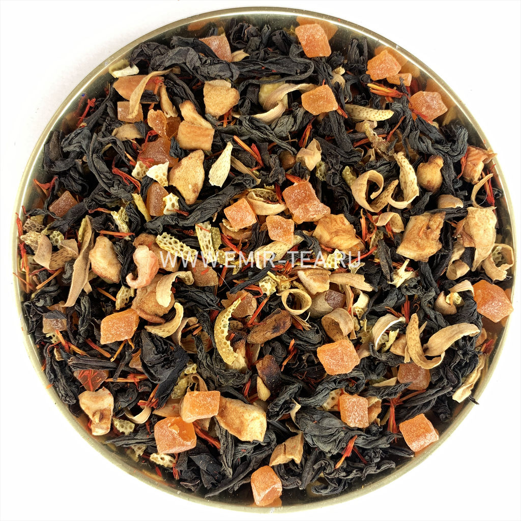 Состав: Индийский черный байховый чай, сафлор, цветки апельсинового дерева, кусочки сушеного яблока, цедра апельсина, цукаты манго, цукаты папайя. Содержит пищевые ароматические масла.