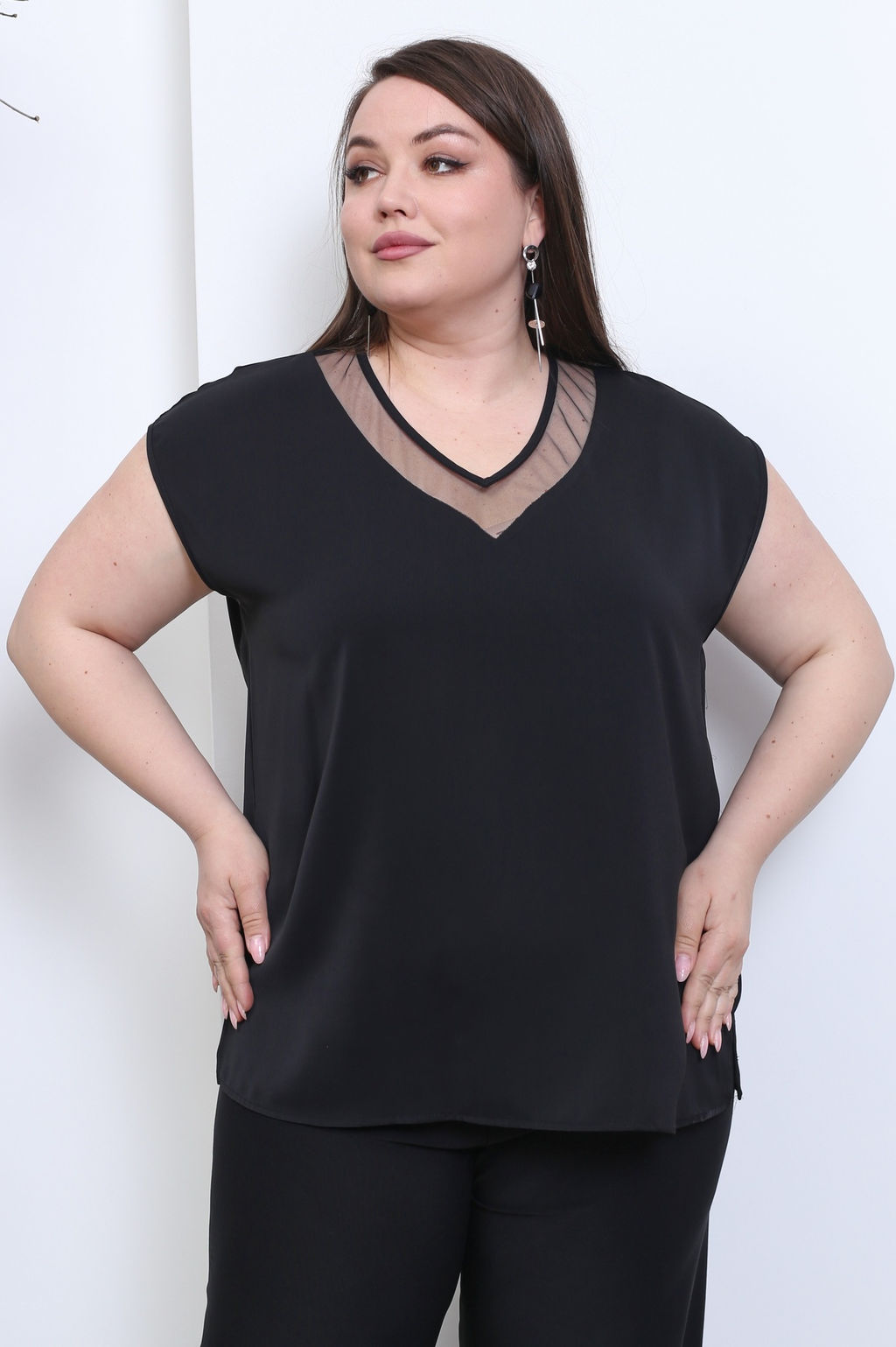 Классическая однотонная блузка свободного кроя из струящегося материала без рукавов. V-образный вырез декорирован фатиновой вставкой, что добавляет модели женственности и романтизма. Модель можно комбинировать с юбками и брюками, так же будет хорошей базой под пиджаки и жакеты. Блузка позволит выглядеть стильно при минимальных финансовых затратах.­
