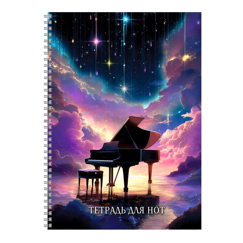 Тетрадь для нот 32 л. арт. 73243 РОЯЛЬ И ЗВЕЗДНОЕ НЕБО /А4, белый офсет, гребень по длинной стороне, облож.- мелованный картон 190 г/м?, матовая ламинация.