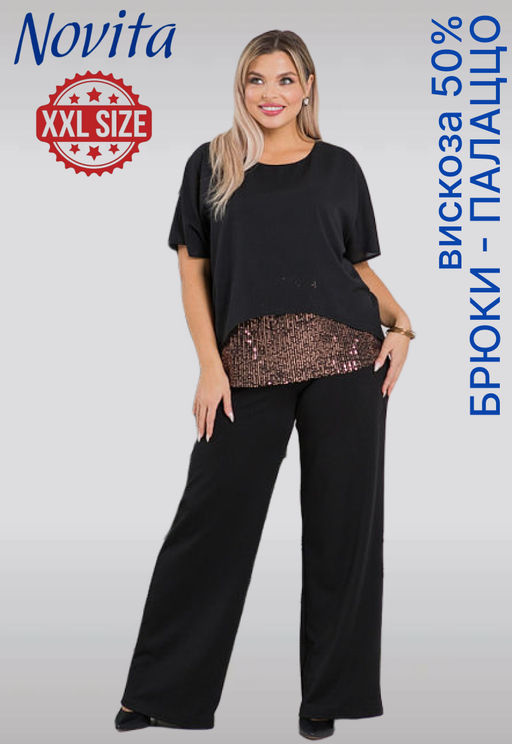 Удобные повседневные брюки-палаццо, выполнены из эластичного трикотажного полотна. Брюки по спинке с поясом, пояс собран на резину, по переду двойная притачная кокетка. Брюки без застежек и подклада. Длина по внешнему шву (с поясом) в 48 р-ре 105 см. в 64 р-ре 110 см., длина по внутреннему (шаговому) шву в 48 р-ре 80 см. в 64 р-ре 80 см.
