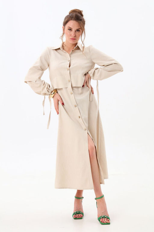 Платье макси с центральной отрезной застёжкой на потайную планку на петли и пуговицы.По переду и спинке цельнокроеные складки на уровне талии. Рукав втачной,одношовный рубашечноно типа. По низу рукава пробиты петли и вставлена завязка для фиксации сборки . Воротник рубашечный стояче отложной. В комплект к изделию идёт пояс из основной ткани для максимально комфортного регулирования объёма.­