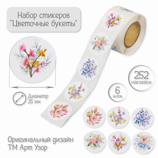 Цена за 2 шт. Наклейка бумага "Цветочные букеты" d=2,5 см 252 шт в рулоне