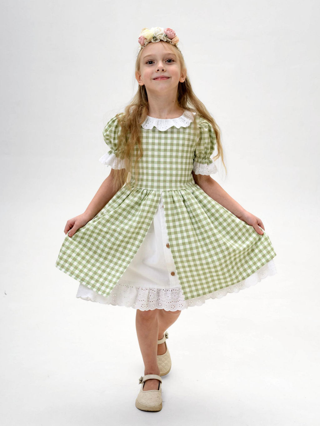 Милое изящное платье  идеально смотрится как на малышках, так и на девочках подросткового возраста.Платье изготовлено из полульняной вареной ткани. Пышный рукав фонарик с оборкой из хлопкового шитья Верхняя юбочка из основной ткани . Нижняя юбочка из плотного сатина с имитацией застежки на деревянные пуговки. По низу нижней юбки волан с хлопковым шитьем. Чуть завышенная линия талии . Сочетание нежного материала, натуральных  кружав и элегантного кроя. Пояс в боковых швах. Сзади застежка молния.