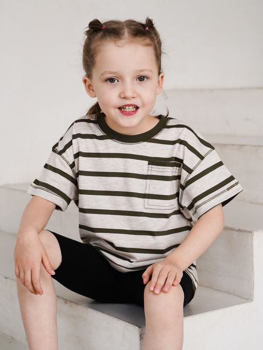 Футболка прямого свободного силуэта с короткими рукавами. Круглая горловина обработана широкой обтачкой в цвет полоски основы. Накладной карман на полочке как у взрослых.