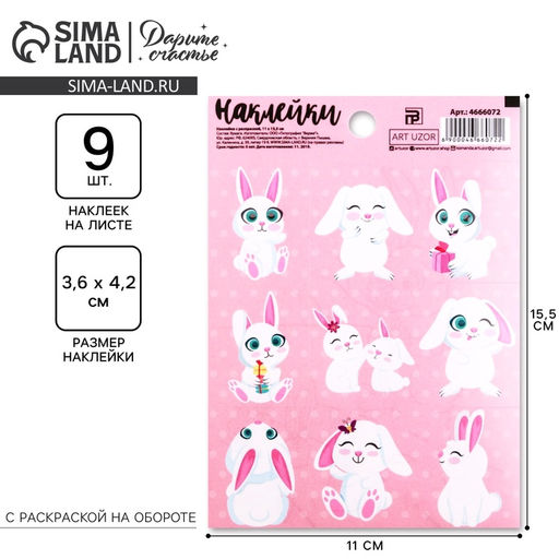Цена за 10 шт. Наклейки детские бумажные «Зайки», c раскраской на обороте, 11 х 15.5 см