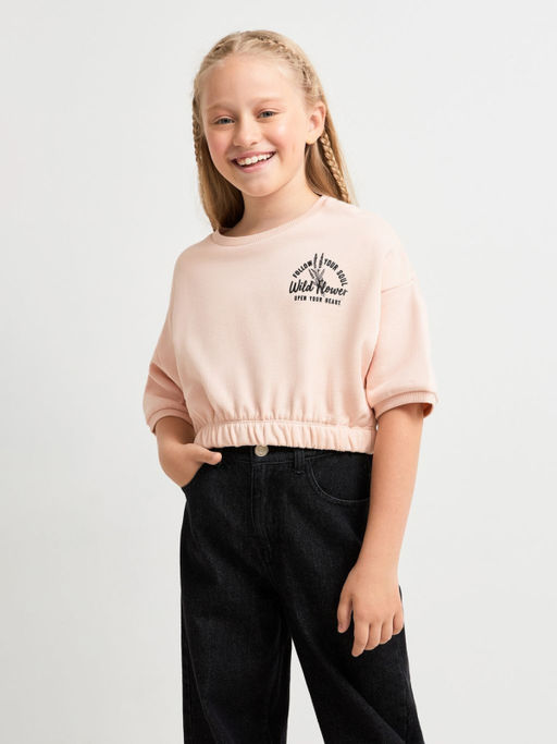 Укороченная толстовка светло-розового цвета для девочек из хлопкового футера на петельной изнанке. Воздухопроницаемый, прочный и приятный к телу материал, за которым легко ухаживать. Округлая горловина, короткие рукава. Нижний край изделия на трикотажной резинке. Объемный текстовый принт: Следуй за своей душой. Дикий цветок. Открой свое сердце. 100%Хлопок