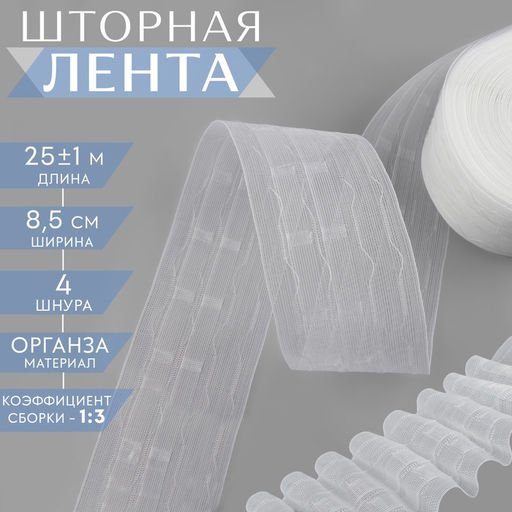 • Шторная лента, органза, 8.5 см, 25±1 м, прозрачная