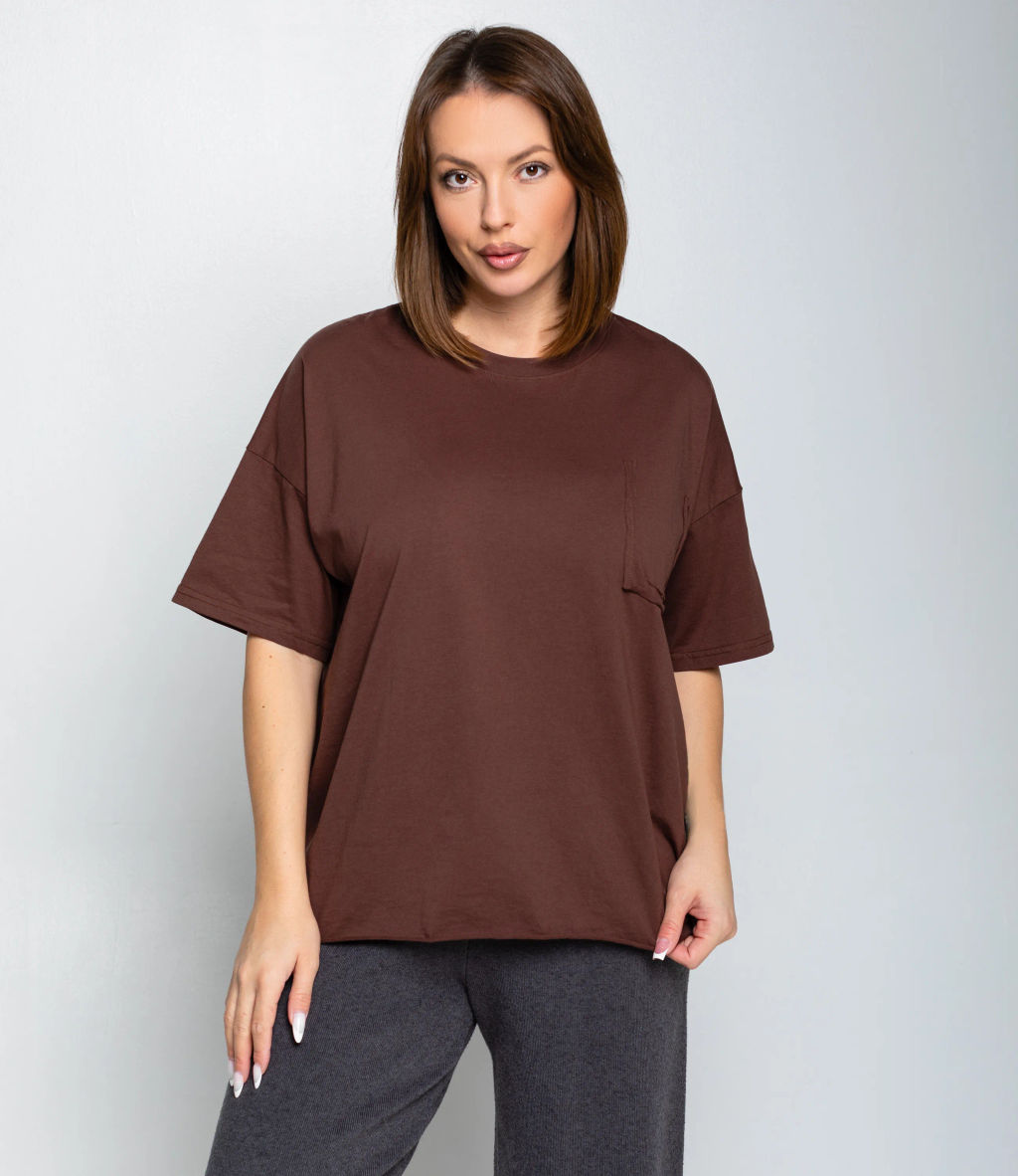 Эта футболка прекрасный выбор для вашего магазина, предлагая стильный и универсальный дизайн, который станет отличным дополнением к гардеробу ваших клиентов. Футболка свободный, прямой крой с короткими рукавами примерно до локтя, высокая круглая горловина с плотной окантовкой, плечевые швы слегка спущены для расслабленного силуэта, длина чуть ниже талии с прямым подолом, на груди небольшая накладная кармашка с аккуратным швом, швы ровные и незаметные, материал мягкий и гладкий без выраженной текстуры, плотность средняя достаточно плотная, чтобы не просвечивать, но с лёгкой драпировкой, рукава со свободным объёмом, внутренняя обработка горловины аккуратная. Выполненная из ткани с 80% хлопка, 20% полиэстер, футболка обеспечивает отличное качество и приятные тактильные ощущения. Независимо от сезона, она станет любимым элементом в гардеробе ваших клиентов. На странице сайта доступна таблица размеров, что позволит вашим покупателям легко найти подходящий вариант. Установленная цена делает эту футболку доступной для широкой аудитории, что обеспечит вам высокий уровень продаж. -- Характеристики -- Цвет: коричневый Пол: Женский Страна производитель: Китай Сезон: Всесезонный Материал: Хлопок, Полиэстер