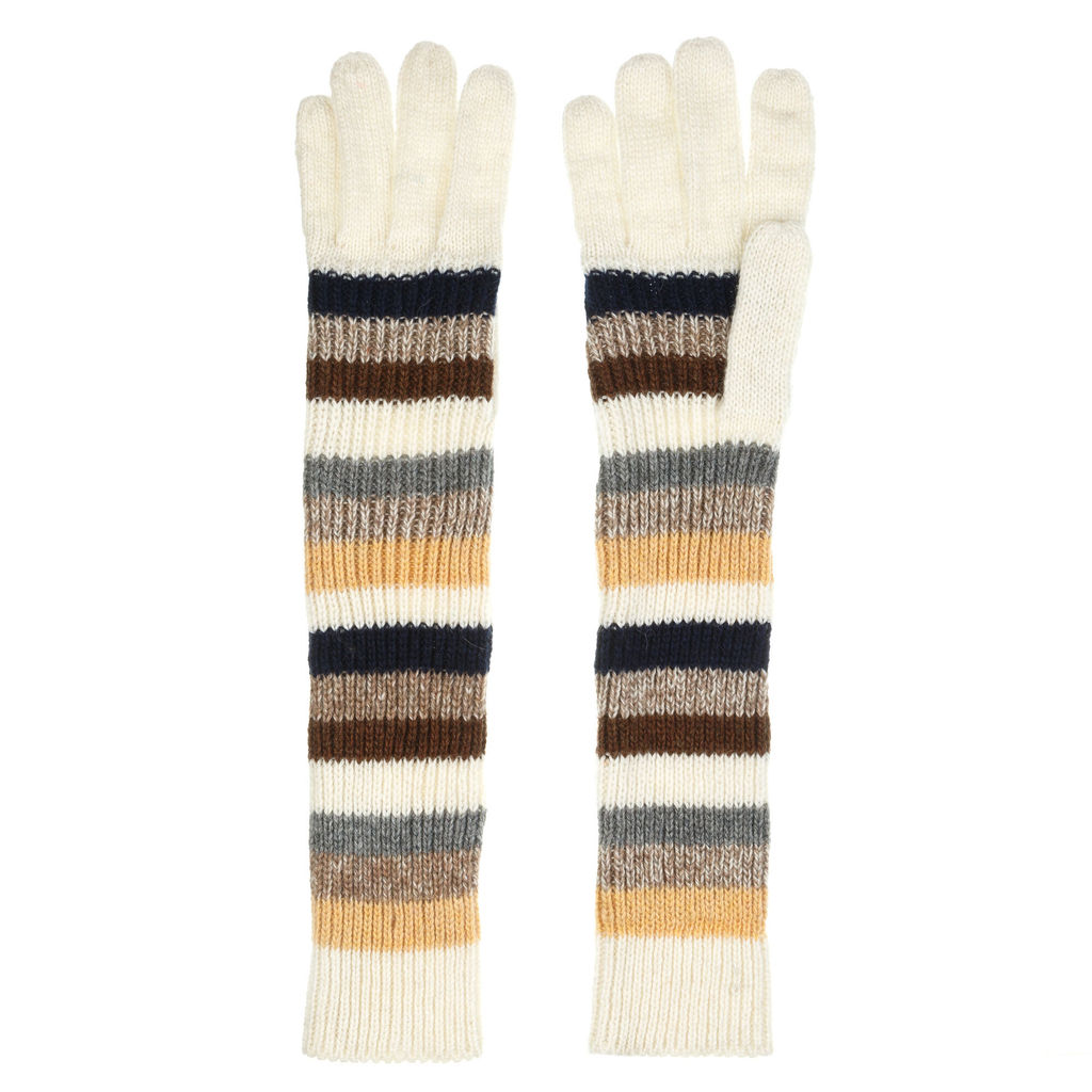Практичные трикотажные перчатки в цветную горизонтальную полоску изумительно подчеркивают изящность и красоту женских ручек. Прекрасно смотрятся с пончо, свитерами, накидками, защищая от осенней прохлады. Стильное цветовое решение направлено на то, чтобы раскрасить серую осенне-зимнюю палитру. Аксессуар содержит в составе натуральную шерсть.