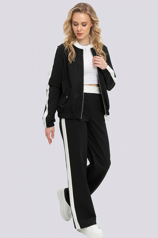 Современные женщины предпочитают выглядеть стильно, ярко, современно, но при этом хочется, чтобы одежда была очень комфортной. Костюм из футера отлично выполняет данные требования. Наша модель состоит из давно полюбившегося бомбера и широких брюк. Бомбер с застежкой на молнию, карманы с клапаном, по низу изделия и рукава резинка. Брюки частично с резинкой по талии, прямые по силуэту. Костюм свободного объема, покрой рукава втачной. Белый лампас и воротник являются ярким элементом в дизайне модели. Цветовая гамма разнообразна: фуксия смотрится очень ярко, сочно; бежевый невероятно нежный; черный очень элегантный. Состав трикотажа: 75% хлопок, 20% полиэстер, 5% спандекс.­