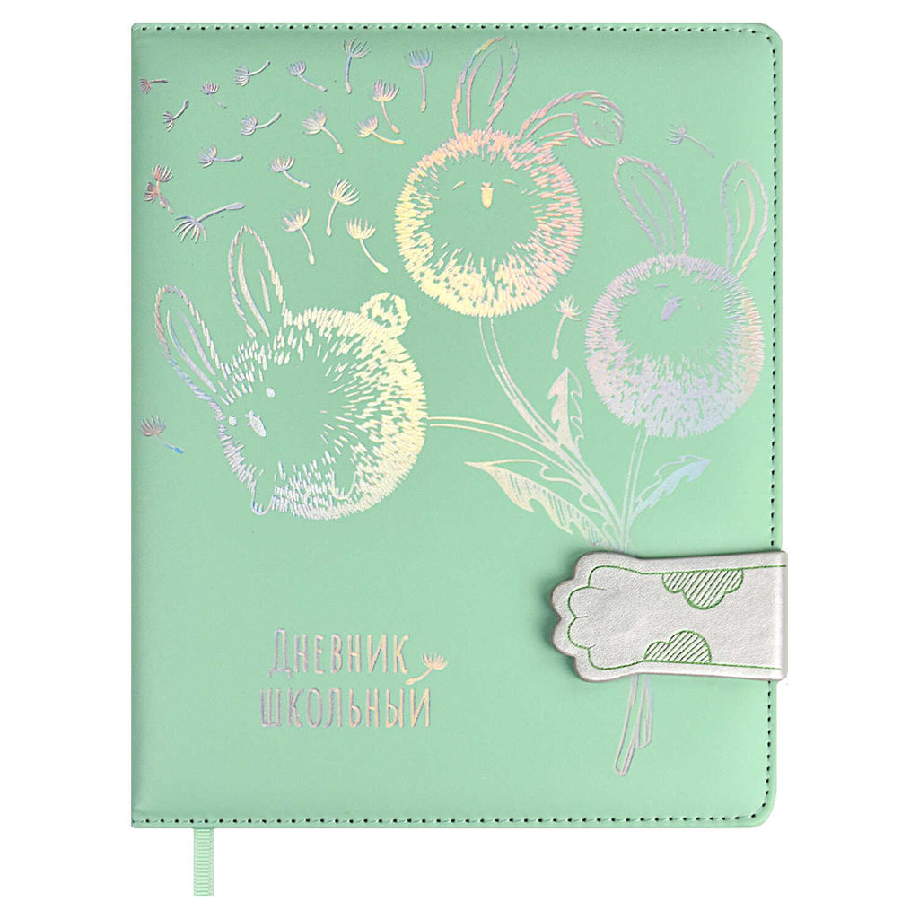 Дневник школьный арт. 62184 / 15 ЗАЙЧИКИ-ОДУВАНЧИКИ (кожзам: А5+; твёрдый переплёт с поролоном, материал обложки: искусственная кожа "Плонже"; декор: тиснение фольгой (2 цвета); способ крепления блока: ниткошвейный; вн. блок: 48 л., белый офсет 80 г/м?, печать в одну краску, справочный материал: универсальная шпаргалка; отделка среза: окрашивание пантоном; закладка: одно ляссе; форзац: печать в одну краску; особенности: запаянный край, магнитный клапан; индивидуальная упаковка: ПЭТ-пакет)