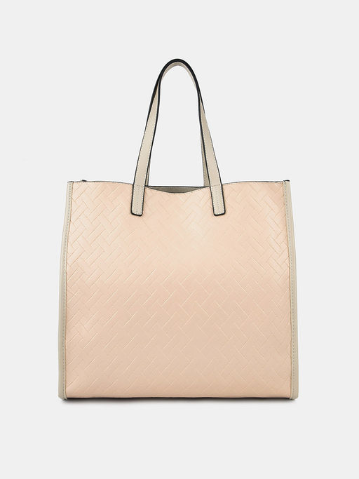 Средняя женская сумка тоут из экокожи бежевого цвета. Оттиск на коже имитирует крупное плетение, что делает поверхность фактурной. Внутреннее пространство дополнено плоским карманом для карт и документов, подкладка из плотного полиэстера надолго сохранит свой вид. Широкое донышко и мягкие стенки делают модель вместительной, она закрывается на молнию.