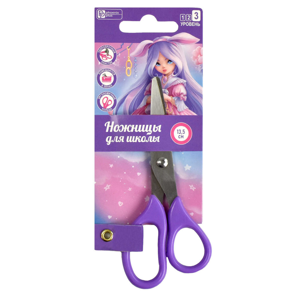 Ножницы для детей Феникс+, арт.66045/ 24 АЛИСА (сиреневый, 13,5х5,6 см, длина лезвия: 5 см, нержавеющая сталь, асимметричные, универсальные, картонная подложка с европодвесом)