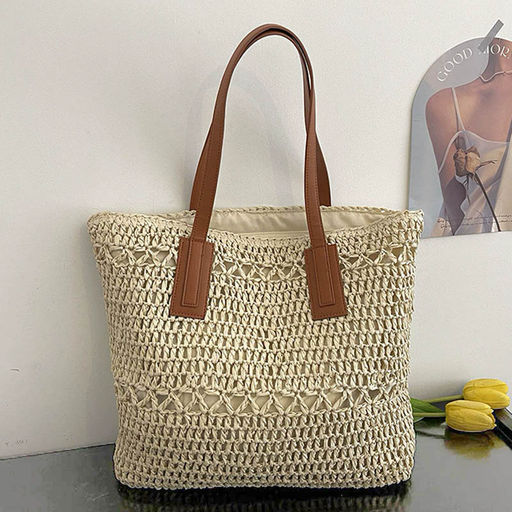 Вместительная плетёная сумка с выразительным декоративным узором и удобными длинными ручками.