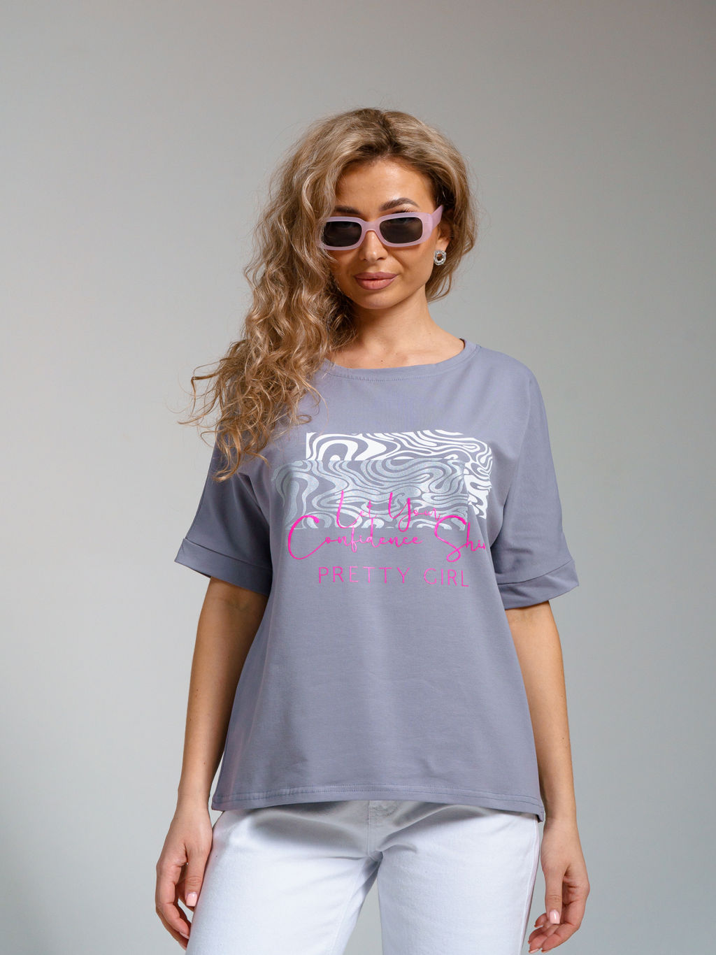 Обратите внимание: фото изделия сделано при искусственном освещении в студии, вживую - цвета могут немного отличаться. Стильная туника выполнена из высококачественного трикотажного полотна (кулирка с лайкрой пенье).Модель прямого силуэта со спущенной линией плеча, рукав втачной. Перед декорирован авторским принтом. Спинка цельнокроеная. Манжеты на рукавах. Яркая офисная туника  свободного кроя, напоминающее длинную футболку, прекрасно подходит для носки каждый день дома или на даче. Удлиненная трикотажная, есть большие размеры. Подойдет вам как домашняя так и для офиса, она гигроскопична и быстро сохнет. Платье туника для беременных, будущих мам, кормящих женщин, в роддом и на выписку. В ней можно отдыхать и заниматься домашними делами, а при необходимости в теплое время и добежать до магазина или погулять с ребенком около дома.