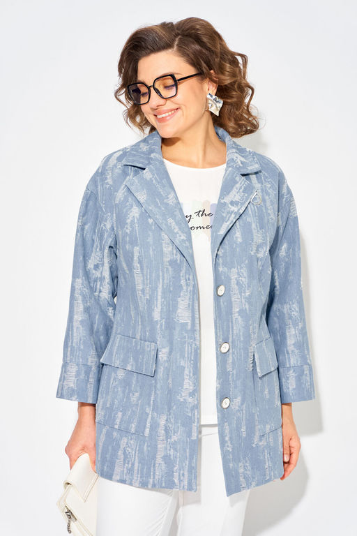 Джинсовый женский жакет идеальный выбор для создания стильного весенне-летнего образа 2026 года.  Современный, светлый дизайн с эффектом гранжа придает свою изюминку изделию. Модель свободного силуэта, на спущенном плечевом поясе. Воротник отложной, английского типа с подбортом. Застежка центральная на петли и пуговицы. По полочке и спинке расположены продольные рельефы для комфортного прилегания.  Спереди расположены накладные карманы с клапаном.