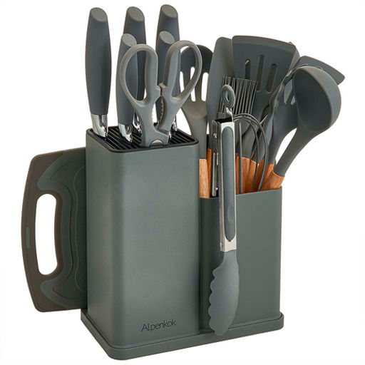 Описание: В наборе 19 предметов: большой поварской нож 20 см 1 штука. нож для нарезки хлеба 20 см 1 штука. разделочный нож 20 см 1 штука. нож универсальный 12,7 см 1 штука. нож для овощей 9 см 1 штука. лопатка 1 штука. лопатка для жарки 1 штука. скребок для теста 1 штука. ложка для слива жидкости 1 штука. салатная ложка 1 штука. ложка для спагетти 1 штука. ложка для смешивания 1 штука. половник 1 штука. щипцы 1 штука. кухонные ножницы 1 штука. кисточка 1 штука. венчик 1 штука. разделочная доска 32х20 см 1 штука. подставка 20х12х22,5 см 1 штука. Набор кухонных ножей и аксессуаров на подставке. Цвет: серый. Материалы: нержавеющая сталь, пластик, силикон, дерево. Высококачественная нержавеющая сталь. Двусторонняя симметричная заточка лезвия ножа. Толщина клинков 1,2-1.5 мм. Нельзя мыть в посудомоечной машине. Упаковка: цветная коробка. Более точную информацию о товаре уточняйте у операторов и консультантов торгового зала. Изображение может отличаться от представленного на витрине. -- Характеристики -- ед.изм.: шт шт/уп: 1