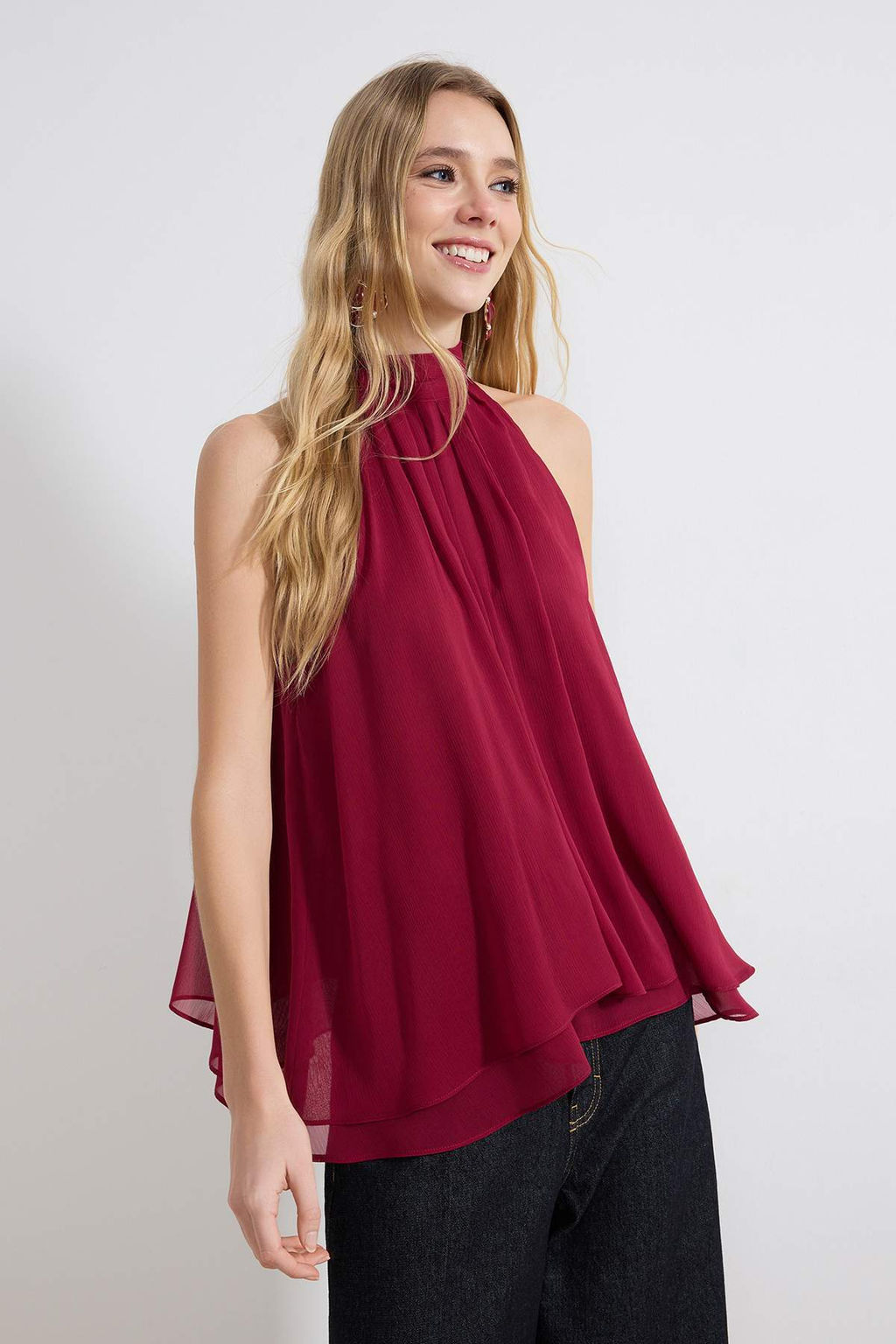Visne Yakas? Baglama Detayl? Ucus Ucus Astarl? Sifon Dokuma Bluz TWOSS26BZ00328
