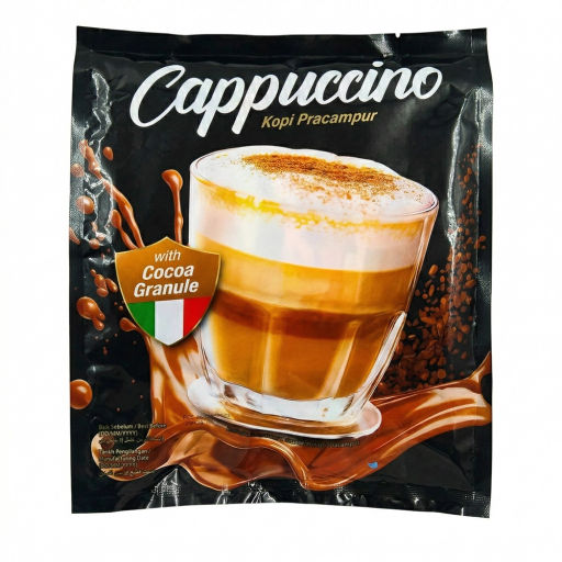 Почтой или ТК: отправляем Артикул: 28234 Вес (брутто), кг: 0.470 Страна: Малайзия Посылаем почтой или ТК: отправляем Упаковка: Пластиковая упаковка. Условия хранения: Хранить в сухом прохладном месте при комнатной температуре. Состав: растительные сливки (глюкозный сироп, растительное масло (пальмовое масло), стабилизаторы (Е340ii, Е451i), молочный белок, эмульгаторы (Е471 из растительных жиров, Е472е), антислёживатель (Е551)), сахар, быстрорастворимый кофе (9%), обезжиренное молоко, стабилизатор (Е440), мальтодекстрин, какао-порошок (0,8%), искусственный ароматизатор (кофе) и подсластитель (Е960). Срок хранения: 24 месяца. Срок годности: | 15.03.2027 Кофейный напиток Капучино Классик растворимый BlackMo - быстрый способ получить порцию любимого напитка. Всего минута и вы наслаждаетесь сбалансированным сочетанием кофейного и молочного вкусов с тонкими шоколадными нотами. Напиток образует мягкую пенку, отличается бархатистой текстурой и легкой горчинкой. Удобная упаковка позволяет брать порционные пакетики капучино с собой на работу, в дорогу или в путешествие. Идеальный выбор для тех, кто ценит комфорт и нежный сладковатый вкус кофе с молоком.
