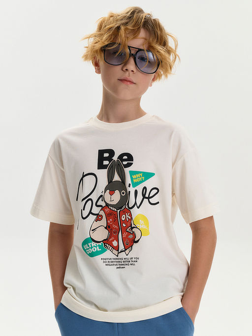 Футболка для мальчика прямого кроя умеренного объема. Уменьшена длина по сравнению с футболками Осень 25. Вырез горловины обработан эластичной рибаной она прекрасно держит форму, не растягивается, при этом ребёнку удобно надевать и снимать футболку. Футболка с принтом и надписями. Перевод: Будь позитивным почему бы и нет?; Так чилово; Ультра круто; Позитивное мышление позволит тебе сделать все лучше, чем негативное мышление.