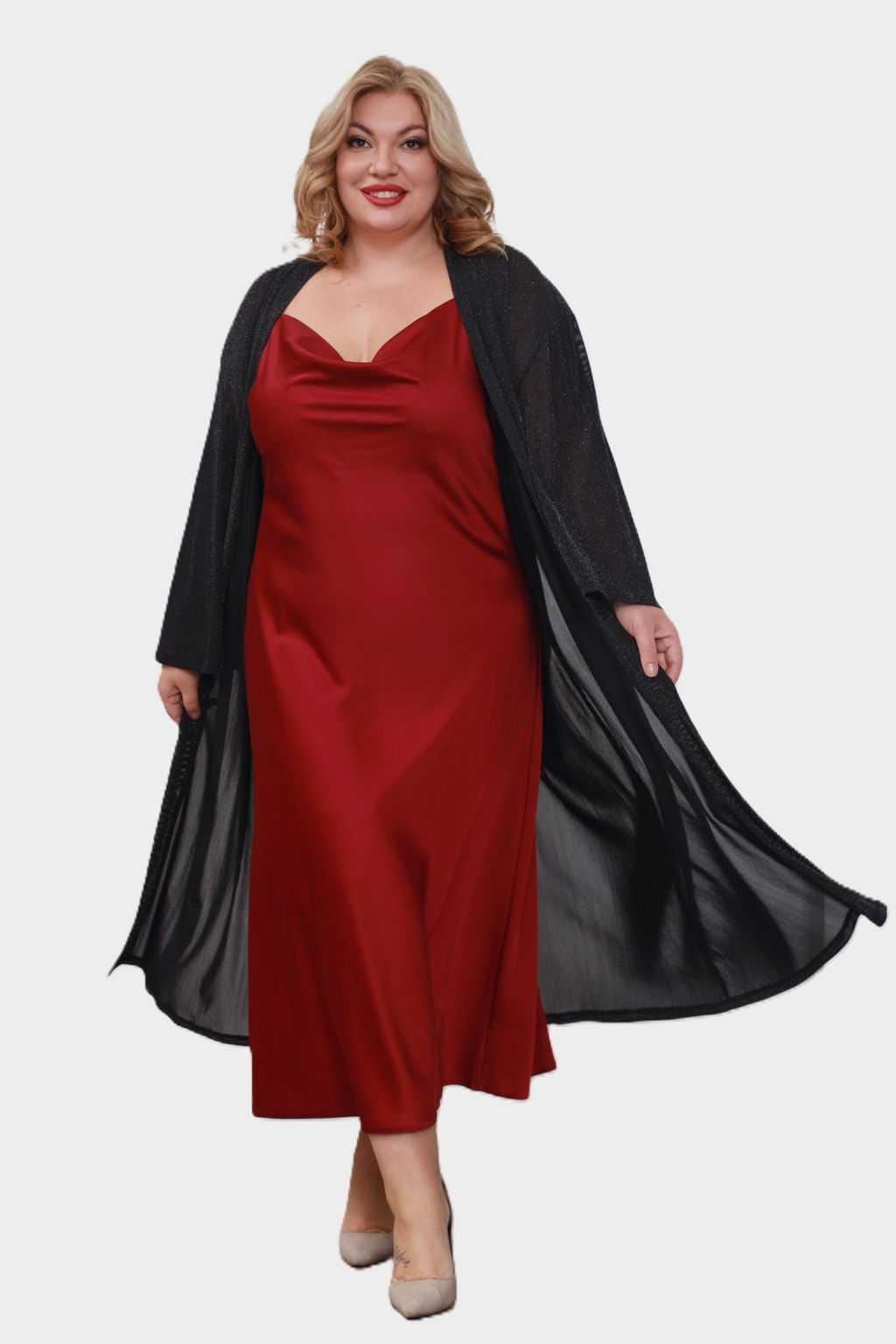Элегантная накидка изготовлена из легкого шифона. Изысканный крой с просторными рукавами длиной до запястья обеспечивает свободу движений и комфорт. Распашной силуэт позволяет легко надевать кардиган через голову. Глубокие разрезы по бокам придают образу женственность и легкость. Тонкий пояс может подчеркнуть талию при желании. Эта вещь маскирует мелкие недостатки фигуры, а однотонная палитра гармонично сочетается с различными базовыми оттенками, создавая стильный и эффектный образ.