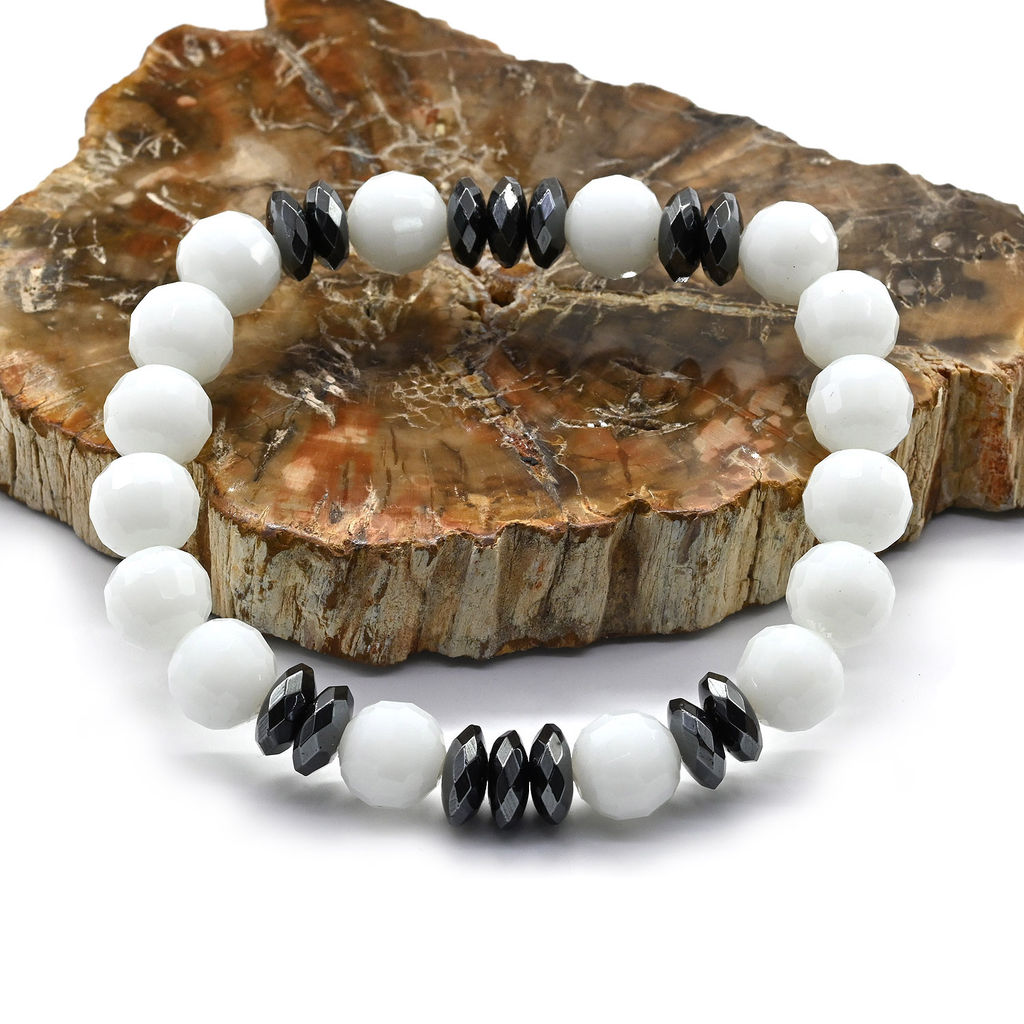 Мужской браслет с шариками из агата белого искусственного со вставками из натурального гематита.