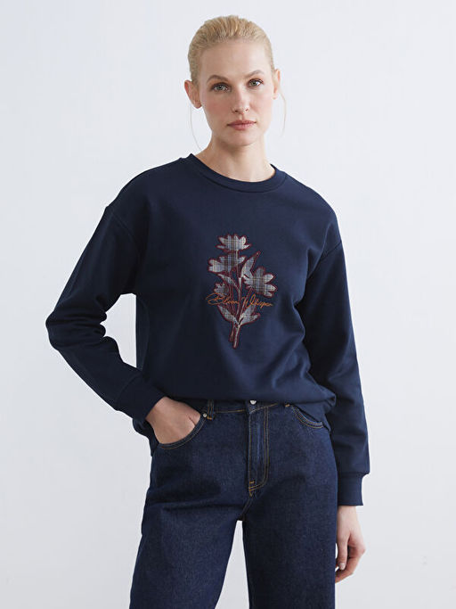 Bisiklet Yaka ?i?ekli Kad?n Kal?n Sweatshirt