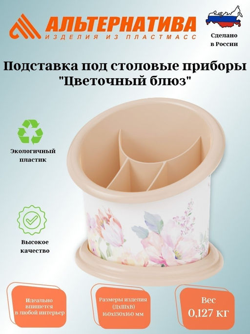 Удобная подставка предназначена для сушки и хранения столовых приборов и разных кухонных принадлежностей (половников, лопаток . Изделие обладает достаточной вместительностью и имеет четыре ячейки для раздельного хранения приборов. Поддон позволяет собирать стекающие капли. Яркий декор не повреждается в процессе эксплуатации изделия и делает подставку своеобразным украшением кухонного интерьера.­