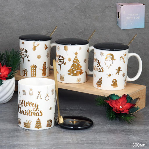 • Кружка новогодняя с крышкой, ложка /300 мл/ HB-074 /уп 60/
