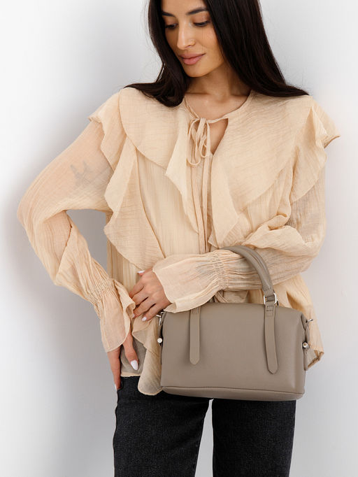 Базовая модель, выполнена из натуральной кожи.  Декорирована элементами на корпусе. Дополнена серебристой фурнитурой. Данная модель закрывается на молнию. Каркас мягкий. Носится в руке за встроенные ручки или на плече. В комплекте съемный ремень с регулировкой длины.
