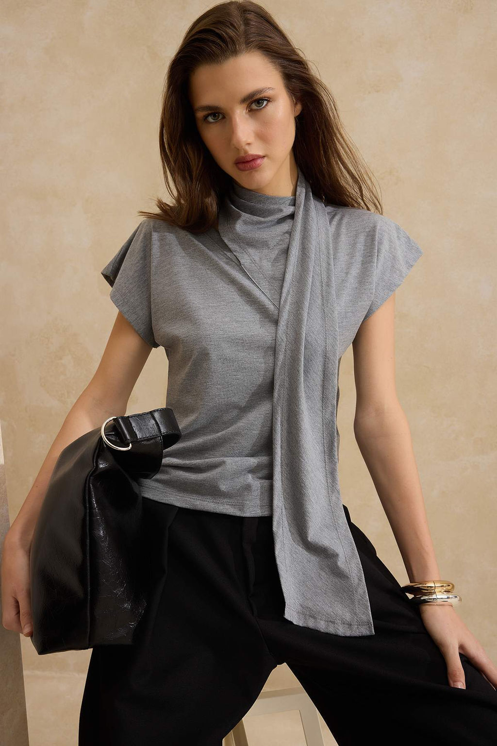 • Antrasit Fitted/Vucuda Oturan Fular Yaka Uzun Kollu Tok %100 Pamuk Orme Bluz TWOSS26BZ00234