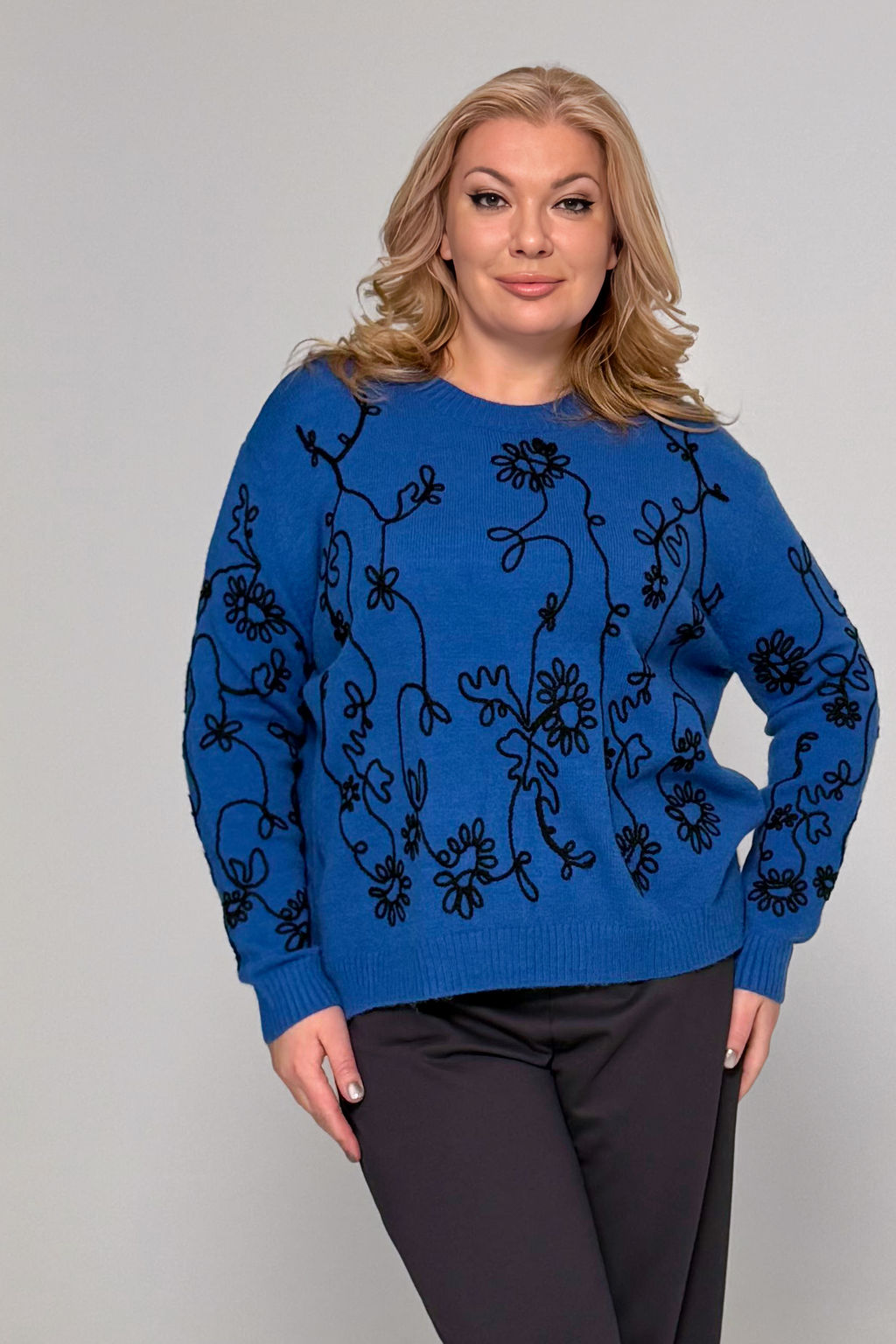Мягкий  свитер свободного кроя выполнена из мягкого трикотажа. Модель имеет круглый вырез и приспущенные рукава полной длины. Контрастная вышивка освежает образ и добавляет элегантности. Полуприлегающий силуэт искусно обыгрывает фигуру, а мягкий материал обеспечивает максимальный комфорт в течение всего дня. Однотонная классическая модель прослужит не один сезон, сохраняя свой первостепенный идеальный внешний вид. Отлично сочетается с юбками и брюками.­