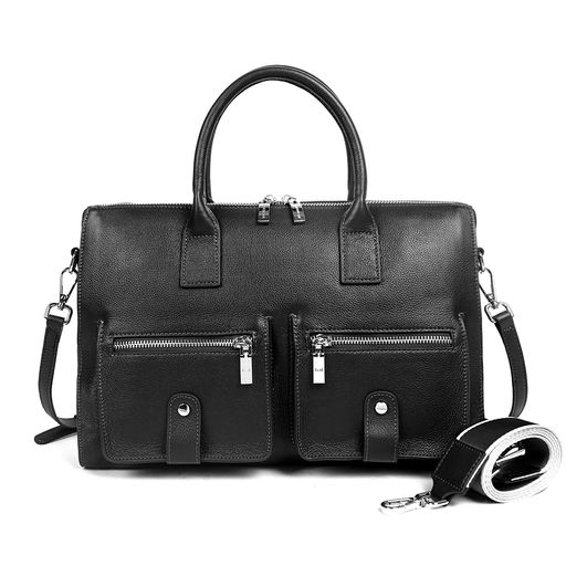 Вместительная сумка-тоут MIRONPAN в черном оттенке выполнена из натуральной зернистой кожи. Основное отделение закрывается на молнию с металлическим поводком. Внутри 3 боковых кармана для мелочей: 2 открытых и на молнии.  На лицевой стороне  два кармана быстрого доступа на молнии . На тыльной стороне предусмотрен карман быстрого доступа на молнии. Плотные ручки позволяют комфортно носить аксессуар в руке. В комплекте идут два съемных плечевых ремня, ширина -2 см, 3 см.   Модель  вмещает формат А4.