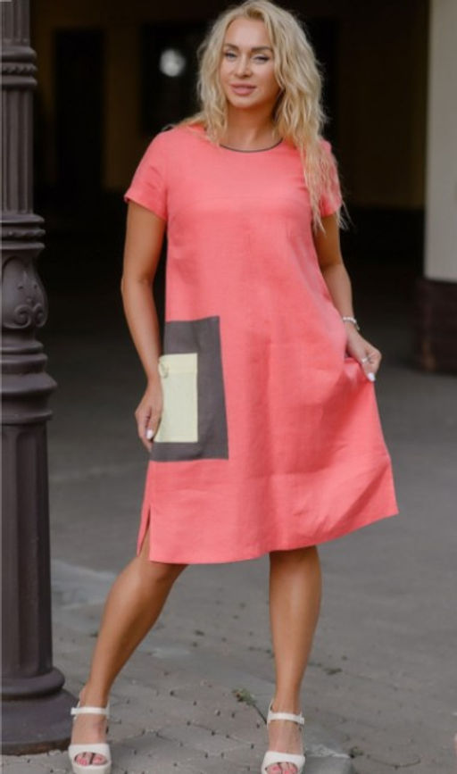 Льняное летнее платье-футляр с рукавом. Оригинально смотрится крупный накладной карман в контрасте с основным цветом платья. По боковым швам имеются 2 небольших разреза. Платье не имеет плотного прилегания, что обеспечивает комфорт при его эксплуатации.