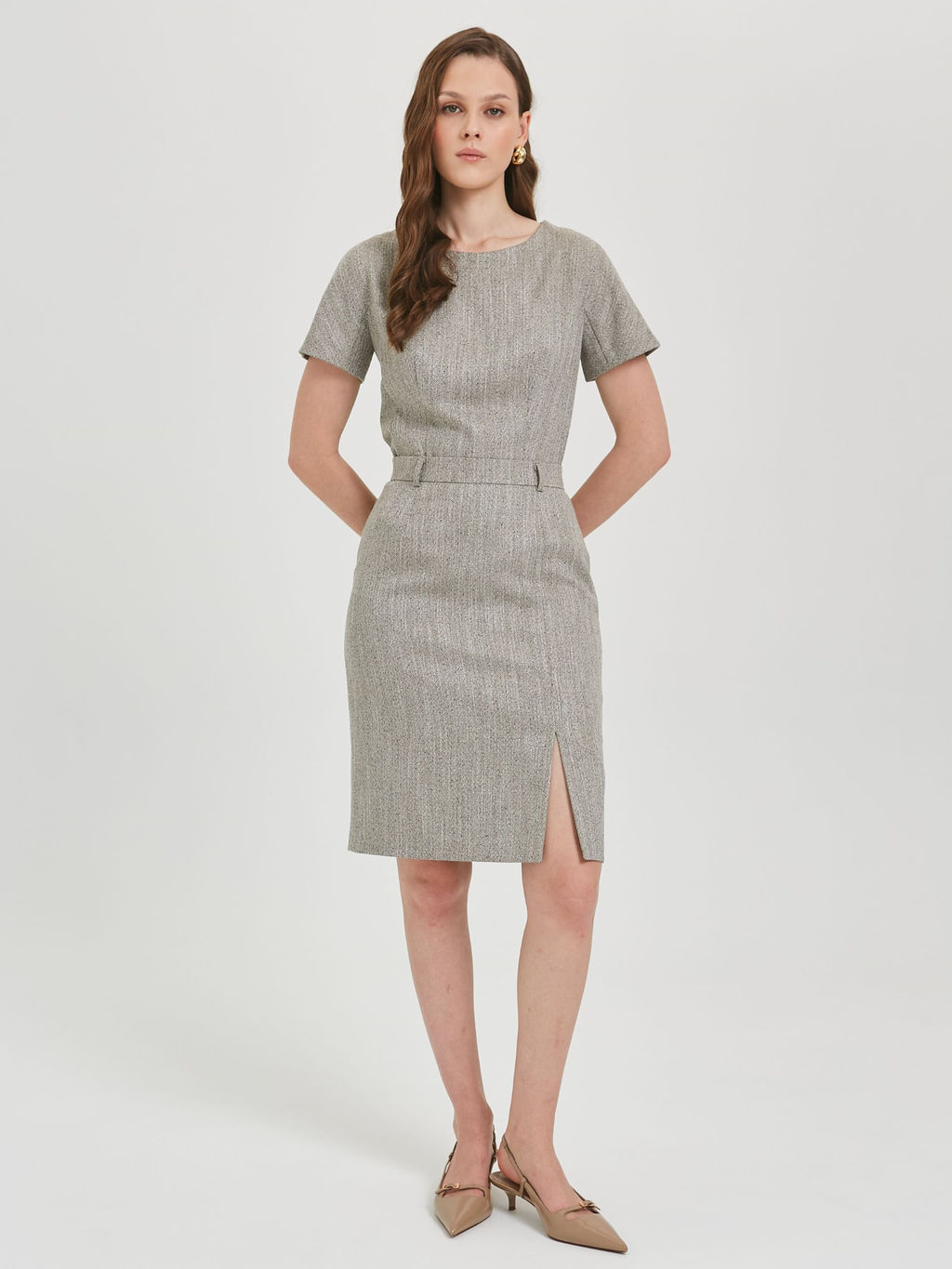 Юбка карандаш. Модель прямого силуэта, на подкладе и притачном поясе со шлёвками. Спереди в рельефе высокий разрез. Сзади прорезной карман с листочкой и застёжкой на пуговицу. В среднем шве обработаны шлица и застёжка на потайную молнию и пуговицу на поясе. Ремень в комплект не входит.