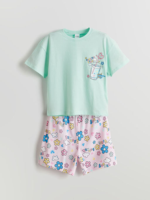 Bisiklet Yaka ?i?ekli K?z ?ocuk ?ortlu Pijama Tak?m?