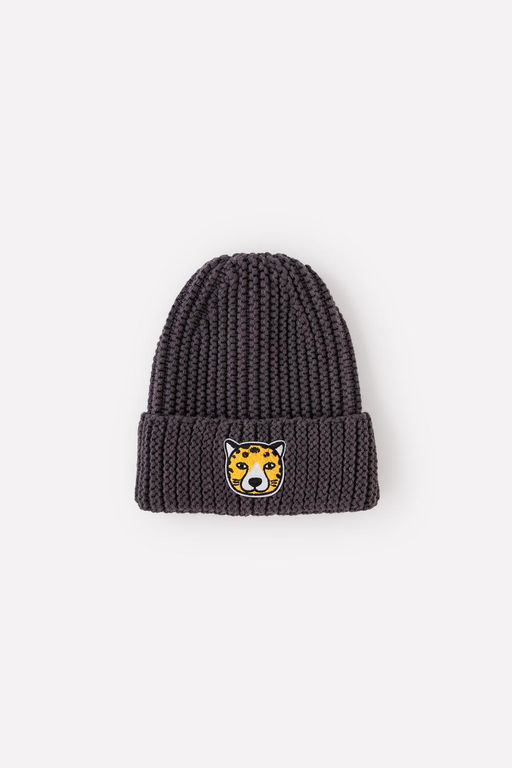 Модная детская шапка с широким отворотом. Связана из полушерстяной пряжи в оттенке "графит". Украшена нашивкой с изображением мордочки леопарда. Состав (материал): Пряжа полушерсть 70% акрил, 30% шерсть