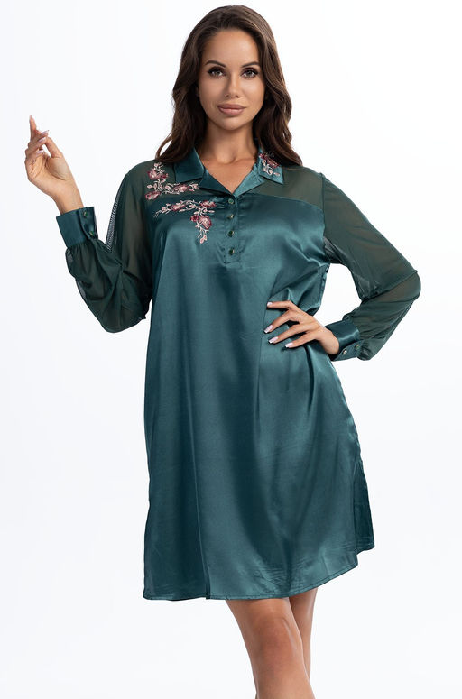 Платье-рубашка Mia-Amore с длинным рукавом, вставками на плечах из сетки и с разрезами по бокам. Цветочная вышивка на воротнике и плече украшена традиционной европейской вышивкой гладью. Ворот застегивается на пуговицы в тон платью, с металлическим ободком под бронзу. Состав:70% натуральный шелк, 25% полиэстер, 5% эластан