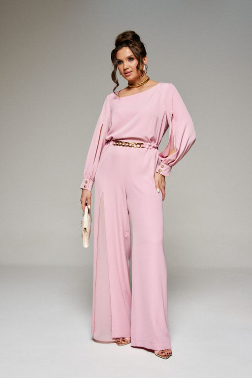 Справа верхняя передняя половинка разрезная по центру: от уровня бедер до низа обработан разрез, из-под которого выглядывает внутренняя отделочная деталь из шифона. Левая половинка брюк комбинезона цельная. Сзади по брюкам комбинезона от пояса расположены вытачки.