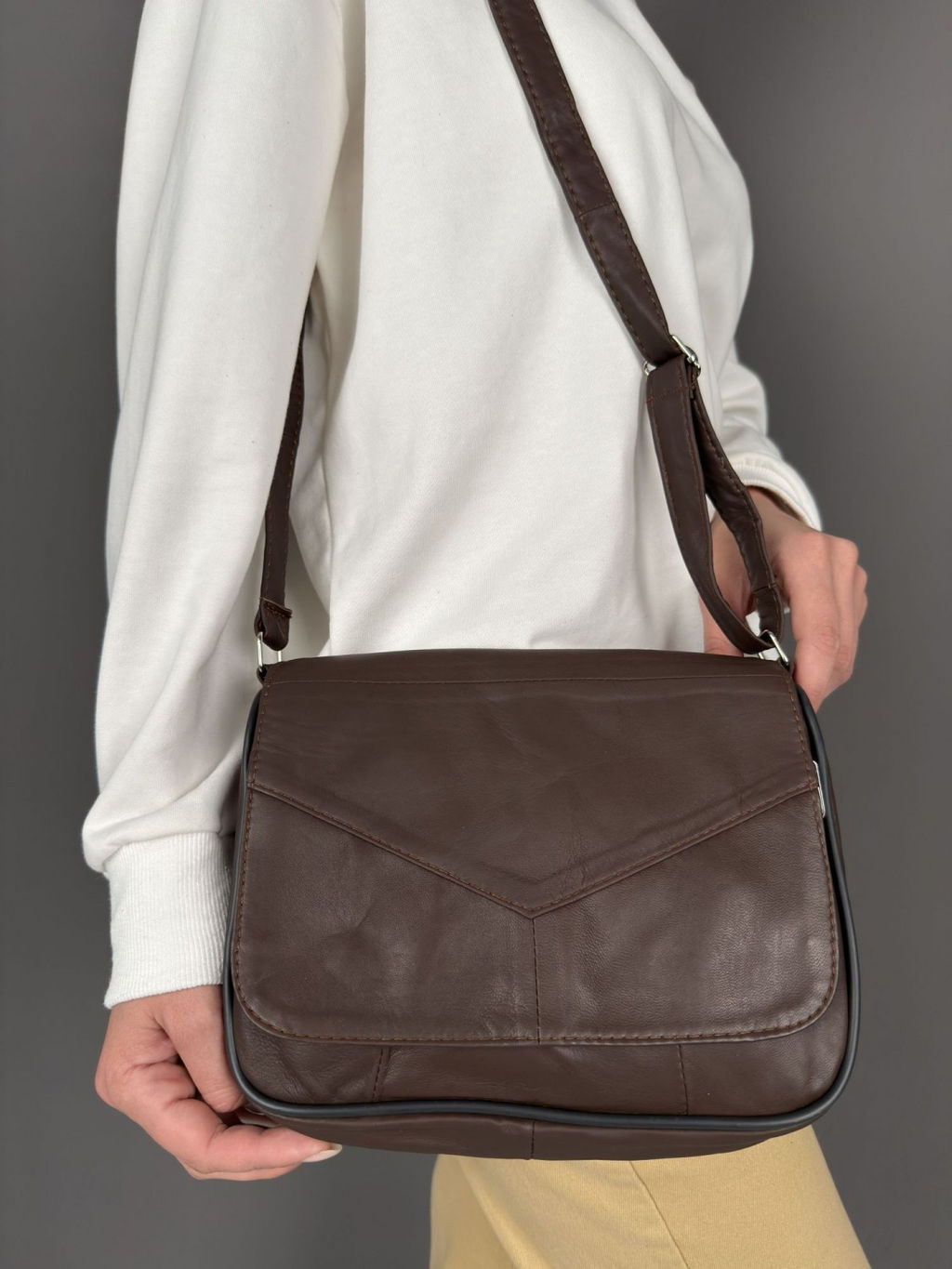 Небольшая аккуратная сумка кросс-боди из натуральной кожи, производства Турция. Мягкая прочная кожа, очень легкая. Закрывается на молнию сверху, дополнительно на клапан с магнитной застежкой. Внутри : 1 отделение , на боковой стенке 1 карман на молнии. На задней стенке снаружи большой карман на молнии. Плечевой ремешок 100 см, регулируется по длине.
