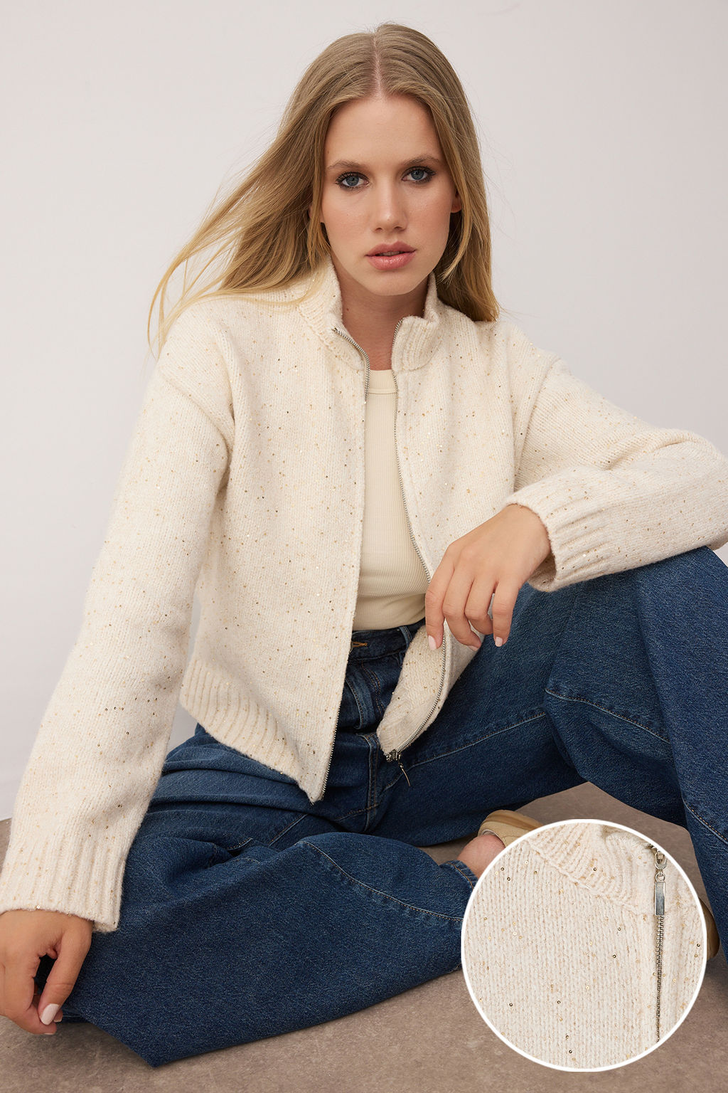 • Tas Fermuarl? Dik Yaka Yumusak Dokulu Vizon Payetli Triko H?rka TWOAW26HI00053