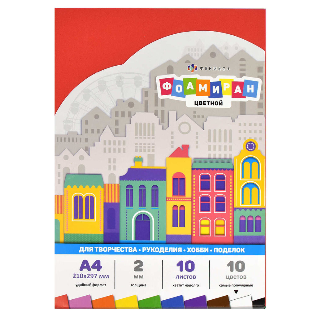 Фоамиран А4, арт. 65985 / 20 ЦВЕТНОЙ (10 ЦВЕТОВ) (размер 210х297 мм, 10 лист/-ов, 10 цвет/-ов, флат-листы из ЭВА толщиной 2 мм; обложка: обложка-вкладыш, мелованная бумага 115 г/м?, полноцветная печать; индивидуальная упаковка: ПЭТ-пакет с европодвесом)