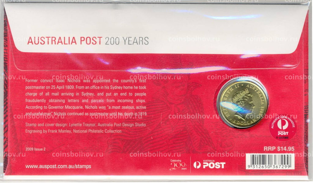 • Монета 1 доллар 2009 года Австралия  200 лет почтой службе Австралии (цветная, в блистере с маркой)