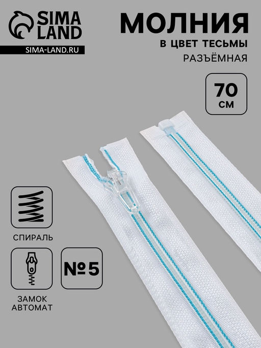 • Цена за 10 шт. Молния «Спираль», №5, разъёмная, замок автомат, 70 см, белая, голубая