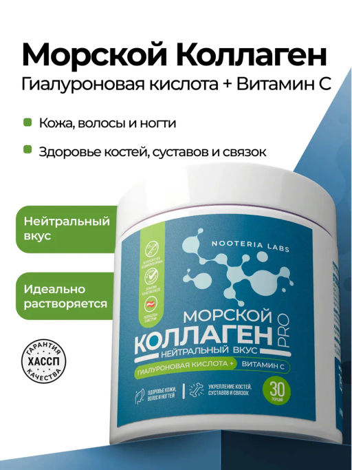 Бьюти Действие: Здоровье кожи, волос и ногтей, Профилактика дефицитов, Укрепление суставов, связок и костей Состав: Витамин С, Гиалуроновая кислота, Коллаген Производитель: Nooteria Labs Форма выпуска: Порошок Количество: 150 г Готовая формула для здоровья кожи, суставов, волос и ногтей Морской коллаген PRO содержит в составе гидролизованный коллаген из морского сырья + Гиалуроновая кислота и Витамин C для максимального усвоения. Это качественное сырье, наиболее эффективная форма и расширенный состав для полноценного комплексного действия. Формула гидролизованного коллагена с добавлением гиалуроновой кислоты и витамина С ускоряет процесс усвоения коллагена и усиливает его бьюти-эффект, поддерживая молодость и красоту. Как работает Морской коллаген PRO: ✓ Увеличивает упругость и увлажнение кожи ✓ Укрепляет волосы и ногти ✓ Повышает минеральную плотность костей ✓ Поддерживает здоровье суставов и связок Красота кожи и волос Укрепление костей и суставов Восполнение дефицита Натуральный морской коллаген В 1 мерной ложке: Гидролизованный Морской коллаген – 4 938 мг Витамин С (аскорбиновая кислота) – 35 мг Гиалуроновая кислота – 28 мг Коллаген усилен гиалуроновой кислотой и витамином С для лучшей усвояемости и эффективности. Мы производим коллаген в форме порошка без красителей и вкусовых добавок, без лишней химии. А для приятного вкуса его можно размешать в любимом напитке, например, в апельсиновом соке. Преимущества Морского коллагена PRO ✓ Сырье высокого качества, со всеми необходимыми сертификатами качества и безопасности. Только чистый морской коллаген без примесей ✓ Гидролизованная (пептидная) форма имеет более короткие пептидные цепи аминокислот и усваивается гораздо лучше по сравнению с цельным коллагеном ✓ Формула с Гиалуроновой кислотой и Витамином С повышает эффективность и делает коллаген готовым комплексом для поддержки здоровья кожи, суставов, волос и ногтей. Эффект приема Морского коллагена PRO Улучшение здоровья кожи, волос и ногтей Укрепление костей и суставов – работает как хондопротектор с высокой степенью усвоения Восполнение дефицита и комплексная поддержка организма Добавка не только закрывает потребность организма в коллагене, но и тренирует его производить свой собственный, заставляя фибробласты работать активнее. В результате вырабатывается в 1,5 раза больше коллагена, чем обычно.
