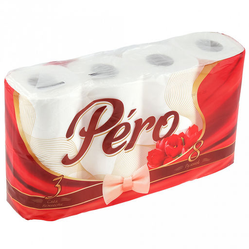 Туалетная бумага 3-х слойная "Pero Tulip", 8 рулона в упаковке, отрывной лист, белый (Россия)