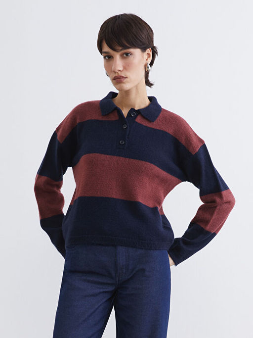 Polo Yaka ?izgili Kad?n Triko Kazak