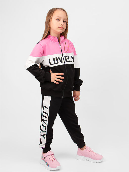 Кофта на молнии, с принтом, воротник стойка-удлиненный. Рукава и низ изделия на манжете. Брюки с вставками по бокам, по низу брючин эластичные манжеты.