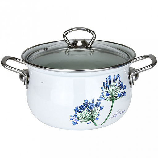 • "Укроп" Кастрюля эмалированная 4л, д20см, сферическая форма, металлическая крышка с пластмассовой ручкой-кнопкой, ободок из нержавеющей стали, белый (Россия)