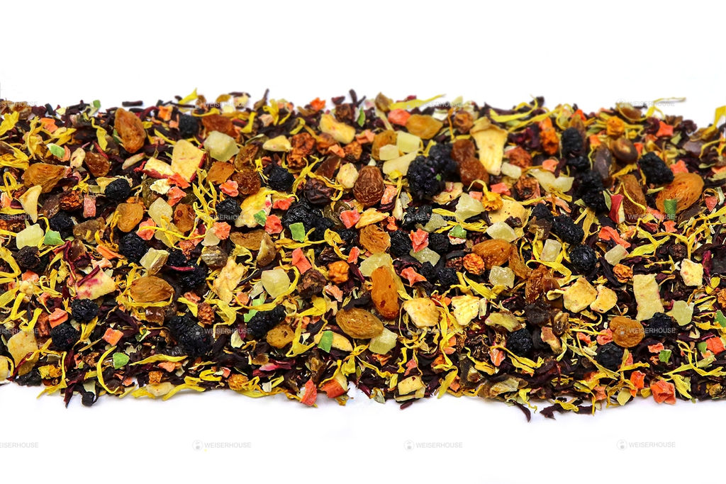 Фруктово-ягодная смесь из гибискуса, изюма, кусочков моркови, финика, яблок и ананаса, ягод тутовника, черноплодной и красноплодной рябины, шиповника, кожуры арбуза и лепестков календулы. Настой ярко-розового цвета с приятным фруктовым вкусом и ароматом.